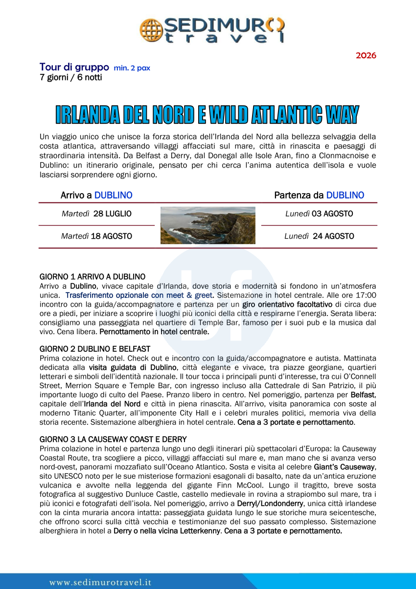 Irlanda del Nord e Wild Atalntic Way da Dublino di martedì 7 giorni